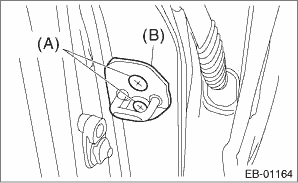 (2) Tap the striker - front door (B) using a plastic hammer to adjust the surface level gap between the rear end of the panel assembly - front door and the front end of the panel assembly - rear door.