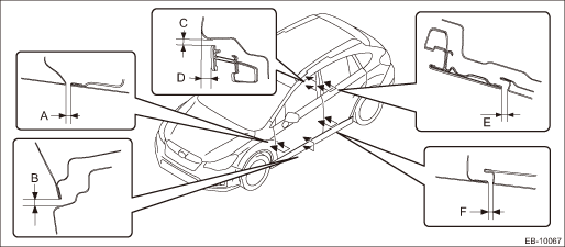 F | Panel assembly - front door to Panel assembly - rear door | 4.5±1.0 mm (0.18±0.04 in) |