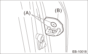 (2) Tap the striker - rear door (B) using a plastic hammer to adjust the surface level gap between the rear end of the panel assembly - rear door and the rear quarter.