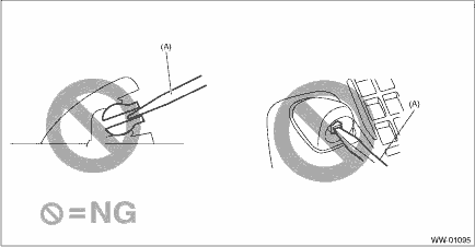 • The nozzle - windshield washer is made of resin. If precision screwdriver (A) or equivalent is inserted into discharge port for adjustment, the discharge port can be deformed, and washer fluid cannot be sprayed.