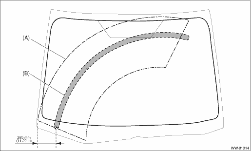 (A) | Wiping area of arm ASSY - windshield wiper assistor | (B) | Spray area |