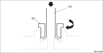 (1) Screw and tighten the flare nut (b) so that the end of the nut contacts the back side of the brake pipe flare, while pressing the brake pipe (a) toward the master cylinder assembly side.