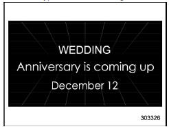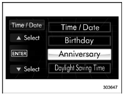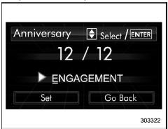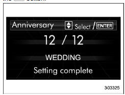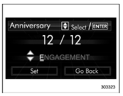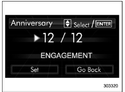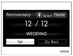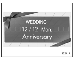 If an anniversary is approaching, the following screen will be displayed accompanied by a beep when the ignition switch has been turned to the "ON" position. This function can be set to on or off. For details, refer to "Bypass screen setting"