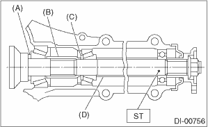 (5) Insert the ST (DUMMY SHAFT) into case with the pinion height adjusting washer and rear bearing cone fitted onto it.