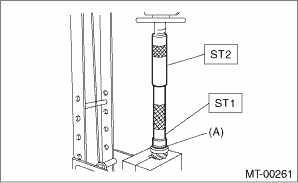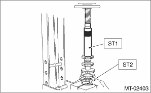 3. Install the 2nd driven gear bushing using ST1, ST2 and a press.