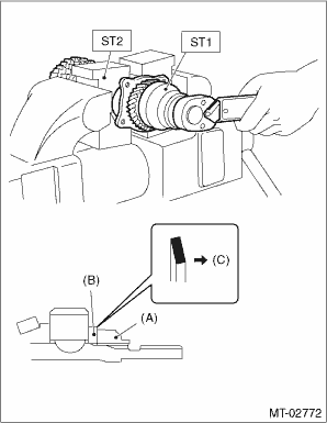 7. Position the woodruff key in groove of the rear of driven shaft. Install the 5th driven gear using ST1, ST2 and a press.