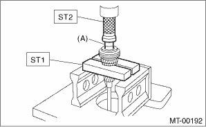 6. Using the ST1 and ST2, install the 5th gear thrust washer and 5th needle bearing race onto the rear section of the main shaft.