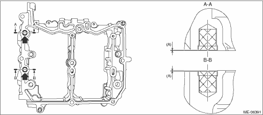 (A) | 28.5 mm (1.122 in) | (G) | Liquid gasket applying position of mating surfaces of range A | (M) | Chamfer edge |