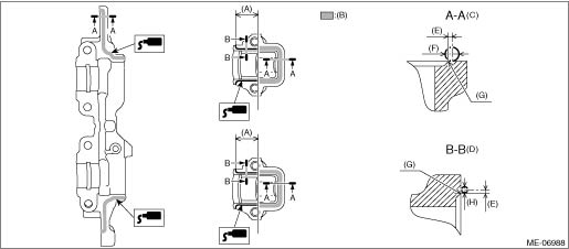 (A) | 28.5 mm (1.122 in) | (D) | Liquid gasket applying position of mating surfaces other than range A | (G) | Chamfer edge |