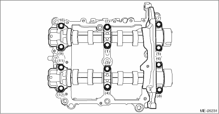 (3) Tighten the bolts which secure front camshaft cap LH, intake center camshaft cap LH, intake rear camshaft cap LH, exhaust center camshaft cap LH and exhaust rear camshaft cap LH in numerical order as shown in the figure.