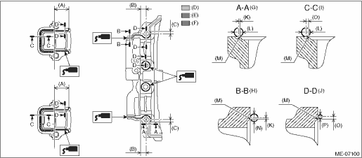 (C) | Liquid gasket applying position of mating surfaces of range A | (F) | φ3.5±0.5 mm (0.1378±0.0197 in) |