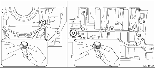 3. Apply liquid gasket to the threaded portions of cylinder block plug and main gallery plug, and install the cylinder block plug (A) and main gallery plug (B) to cylinder block RH.