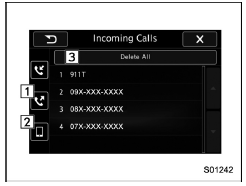 | 3 | Delete all incoming call history data. The "Delete All" key is disabled when there is no incoming call history. |