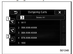 On the phone (menu) screen, select the "Outgoing Calls" key to open the "Outgoing Calls" screen. You can make a call by selecting an item in the outgoing call history list.
