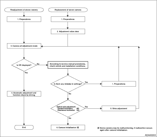 Perform the adjustment in the following order: [1. Preparations] > [3. Camera all adjustment mode (replacement/removal)] > [4. Automatic adjustment and function check by driving].