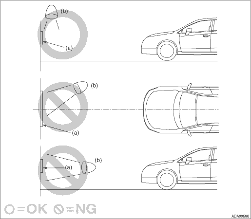 If there are any dirt, object or reflection from dashboard within the visibility of stereo camera, the correct adjustment and inspection can not be performed. Especially, do not put paper etc. on the dashboard.