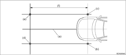 (3) Make markings at the points 4,000 mm (13 ft, 1 1/2 in) ahead of the vehicle from the point C and point D. (Point E and point F)