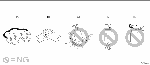 • When the engine is running, do not open the high-pressure valve of manifold gauge. The high-pressure gas will back-flow resulting in an explosion of the can.
