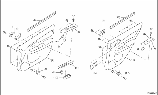 (5) | Switch - door lock sub | (11) | Panel - power window main switch | (17) | Bracket - door trim rear |