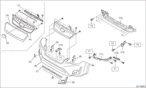 (4) | Front grille ASSY | (11) | Bracket - front bumper corner | T3: | 65 (6.63, 47.9) |