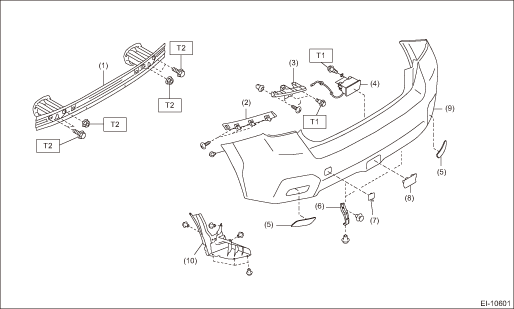 (2) | Bracket - rear bumper side | (7) | Cover - rear bumper A | T1: | 7.5 (0.76, 5.5) |