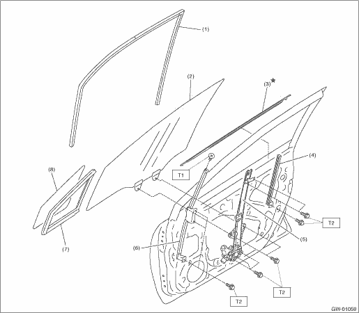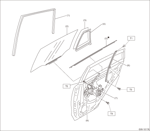 (4) | Weather strip - rear door partition | (8) | Regulator - rear | T3: | 7.5 (0.76, 5.5) |