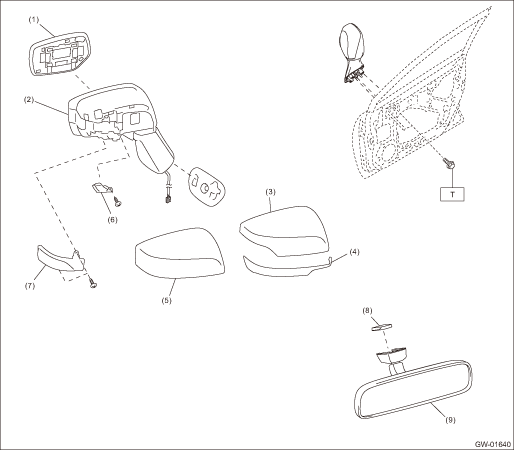 (1) | Mirror - repair | (5) | Cover - cap outer mirror (model without side turn) | (9) | Mirror ASSY - inner rearview |