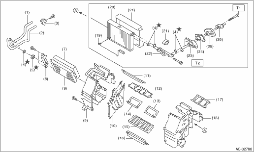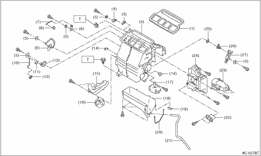 (8) | Heater core | (18) | Case - heater unit UPR RH | Tightening torque: N·m (kgf-m, ft-lb) | |