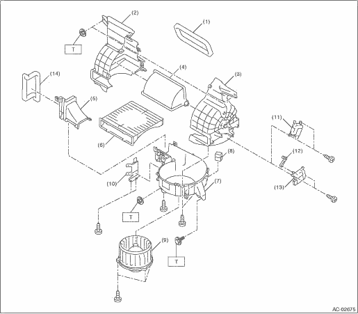 (5) | Case upper - blower | (11) | Motor - actuator blower (auto A/C model) | T: | 7.5 (0.76, 5.5) |