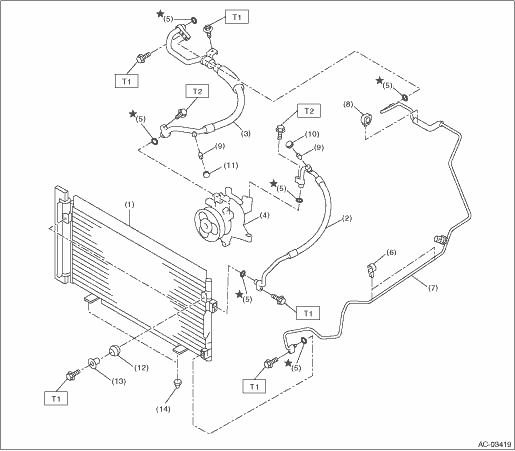 (4) | Compressor ASSY | (10) | Cap - hose pressure discharge | Tightening torque: N·m (kgf-m, ft-lb) | |