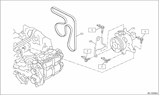 (1) | Compressor ASSY | (3) | Hanger - engine front | Tightening torque: N·m (kgf-m, ft-lb) | |