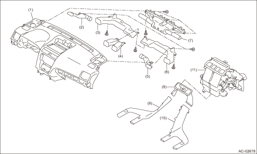 (1) | Panel COMPL - instrument | (5) | Duct - side defroster RH | (9) | Duct - rear heater LH |