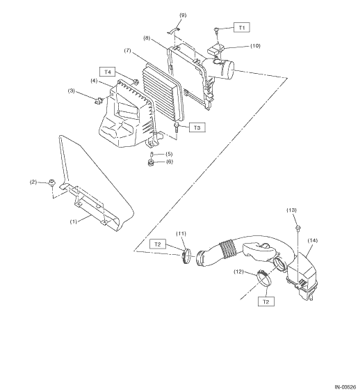 (3) | Cushion | (10) | Mass air flow and intake air temperature sensor | T2: | 3 (0.3, 2.2) |