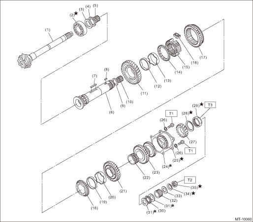 (11) | 1st driven gear | (25) | Double taper roller bearing | T2: | 120 (12.2, 88.5) |