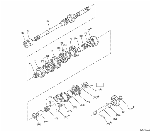 (2) | Needle bearing | (15) | 4th needle bearing | (27) | Lock nut |