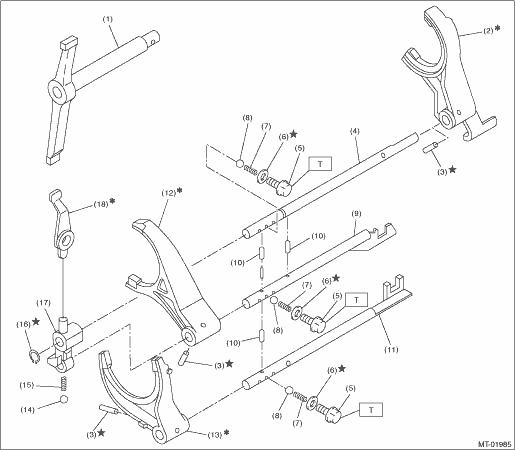 (5) | Checking ball plug | (12) | 3rd-4th shifter fork | ||