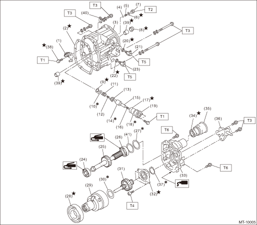 (7) | Plug | (24) | Taper roller bearing (transfer case side) | (40) | Transmission hanger |