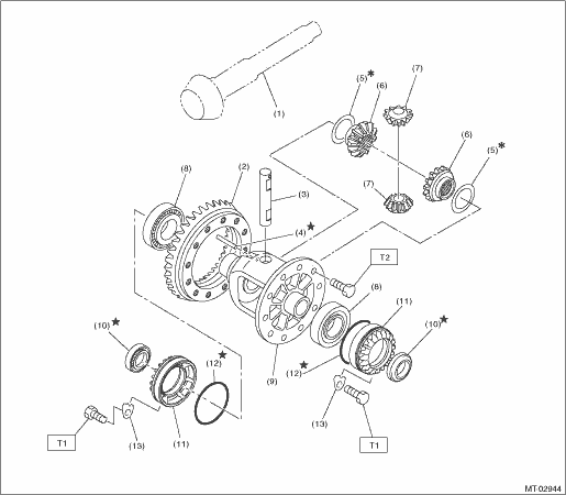 (5) | Adjusting washer | (11) | Differential side retainer | T2: | 62 (6.3, 45.7) |