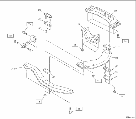 (5) | Transmission cushion rubber | (11) | Rear cushion rubber | T4: | 70 (7.1, 51.6) |