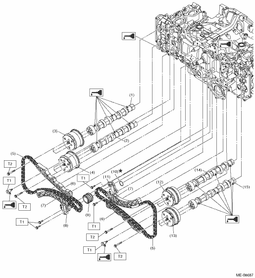 (1) | Intake camshaft RH | (8) | Chain tensioner RH | (15) | Exhaust camshaft LH |