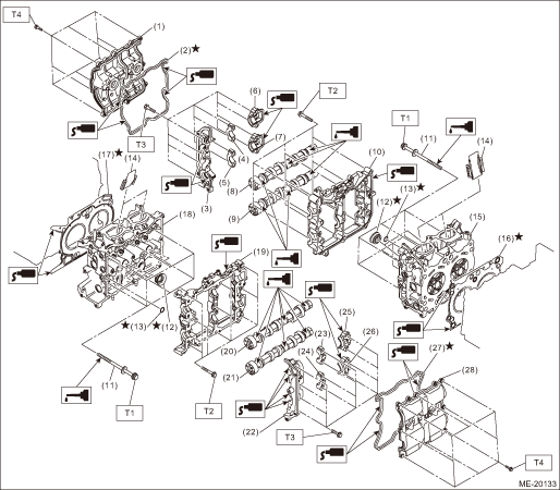 (5) | Gasket | (15) | Front oil seal | T1: | 6.4 (0.7, 4.7) |