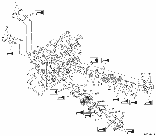 (3) | Intake valve guide | (8) | Valve collet | (13) | Exhaust valve oil seal |