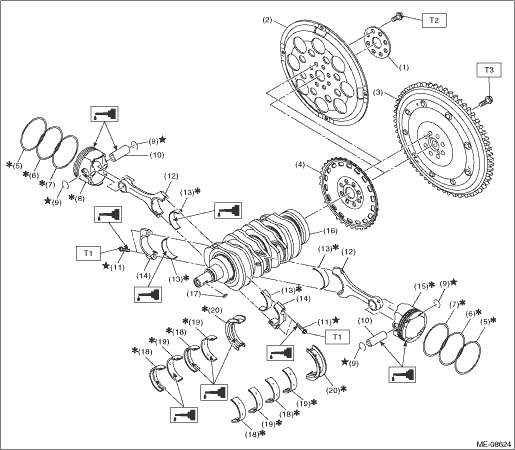 (1) | Reinforcement drive plate (CVT model) | (10) | Piston pin | (19) | Crankshaft bearing #2, #4 |