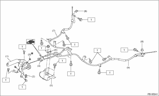 (3) | Adjusting nut (self-locking nut) | (7) | Cable ASSY - parking brake RH | Tightening torque: N·m (kgf-m, ft-lb) | |