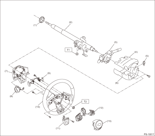 (4) | Cover ASSY - column UPR | (10) | Steering wheel | T1: | 20 (2.04, 14.8) |