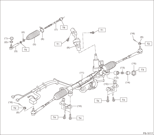 (4) | Clip - boot tie-rod end A | (12) | Pad - pressure | T3: | 49.4 (5.04, 36.4) |