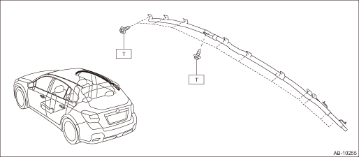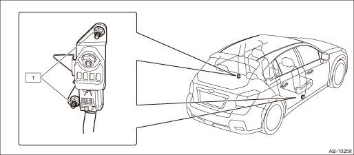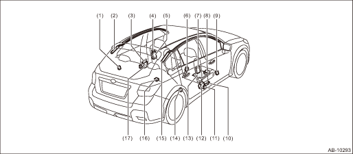(3) | Seat belt pretensioner LH | (9) | Front door impact sensor RH | (15) | Curtain airbag module RH |