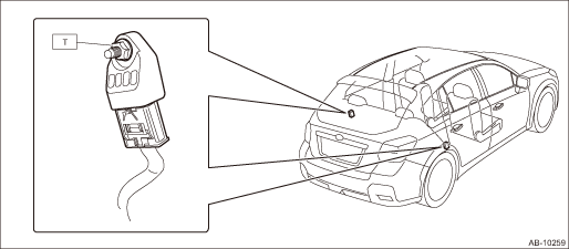 (1) | Front sub sensor RH | (4) | Airbag warning light (in combination meter) | (7) | Airbag control module |