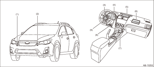 (2) | Front sub sensor LH | (5) | Airbag ON/OFF indicator light (MFD) | (8) | Knee airbag module |