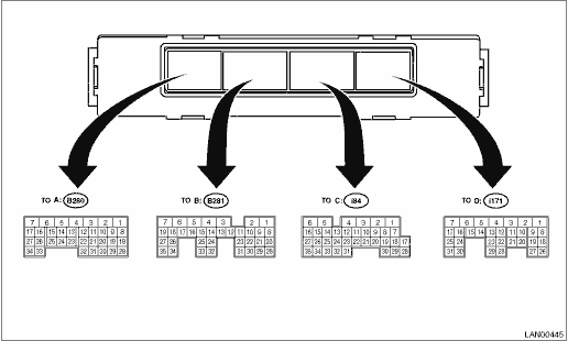 ACC input | A4 ←> Chassis ground | Less than 1.5 V > 10 — 13 V | ACC ON (model with the keyless access with push button start system) |